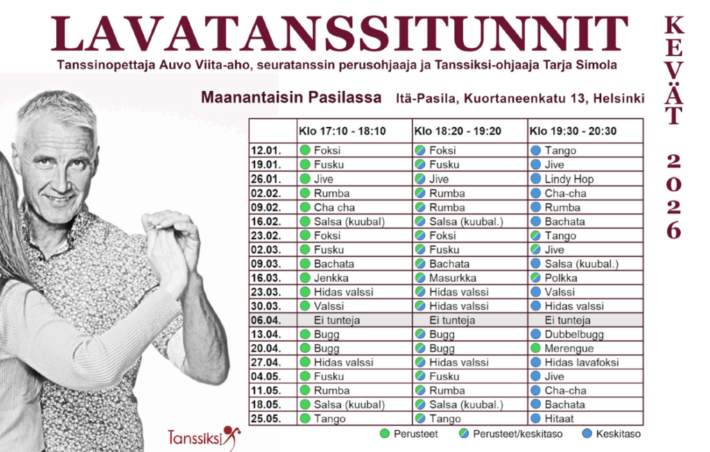 Auvon tanssikurssien tunnit jatkuvat perinteisellä maanantai-keskiviikko -konseptilla, joskin illan kulkuja ja lajien asemointia on hieman muunneltu. Uutena nyt myös Tanssiksi-tunteja alkuillasta (solotanssia). Lataa kevään 2026 ohjelma tästä linkistä. Mukana opettamassa on myös seuratanssin perusohjaaja Tarja Simola.